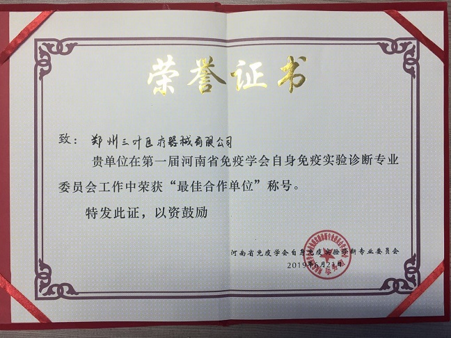 6月21日-22日,由河南省免疫學(xué)會(huì)自身免疫實(shí)驗(yàn)診斷專業(yè)委員會(huì)主辦的2019年河南省免疫學(xué)會(huì)自身免疫實(shí)驗(yàn)診斷專業(yè)委員學(xué)術(shù)年會(huì)在新鄉(xiāng)市開(kāi)元名都大酒店成功舉辦,鄭州三葉公司本著同學(xué)習(xí)共進(jìn)步的態(tài)度并以公司代理的德國(guó)歐蒙、法國(guó)SEBIA蛋白電泳等產(chǎn)品為代表進(jìn)行參展,參會(huì)的專家、學(xué)者等于會(huì)人員均對(duì)我司代理的產(chǎn)品及服務(wù)給予高度評(píng)價(jià),河南免疫學(xué)會(huì)自身免疫實(shí)驗(yàn)診斷專業(yè)委員會(huì)依據(jù)我司在學(xué)會(huì)第一屆期間及以往在河南省綜合服務(wù)表現(xiàn)授予我司暨鄭州三葉醫(yī)療器械有限公司“最佳合作單位”榮譽(yù)稱號(hào)!